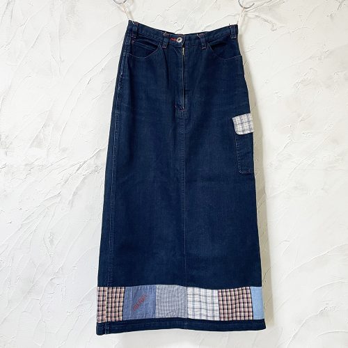 思い出のタイトスカートです。生地が気に入って捨てられなくて相談しました。裾のチェックの部分をいかしてほしいというリクエストにも応えていただき、外側のポケットも全部生かされていました。あんまり素敵なので、SNSで宣伝しています。