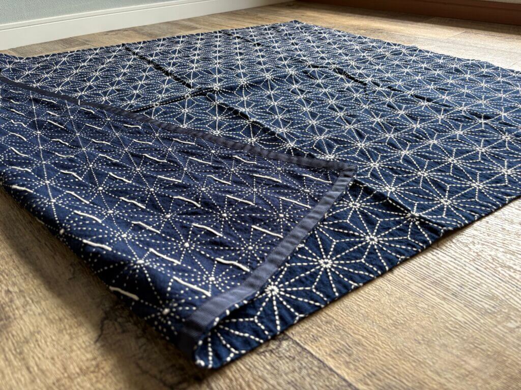 約120×100センチという大きな布一面に施された、たいへん立派な刺し子です。この緻密な模様からは、お母様が針を通す音が聞こえてくるかのようでした。家族の無事を願う生活の知恵から生まれた伝統工芸の重みを損なわないよう、現代のライフスタイルに合うボニーバッグへの再生をご提案しました。