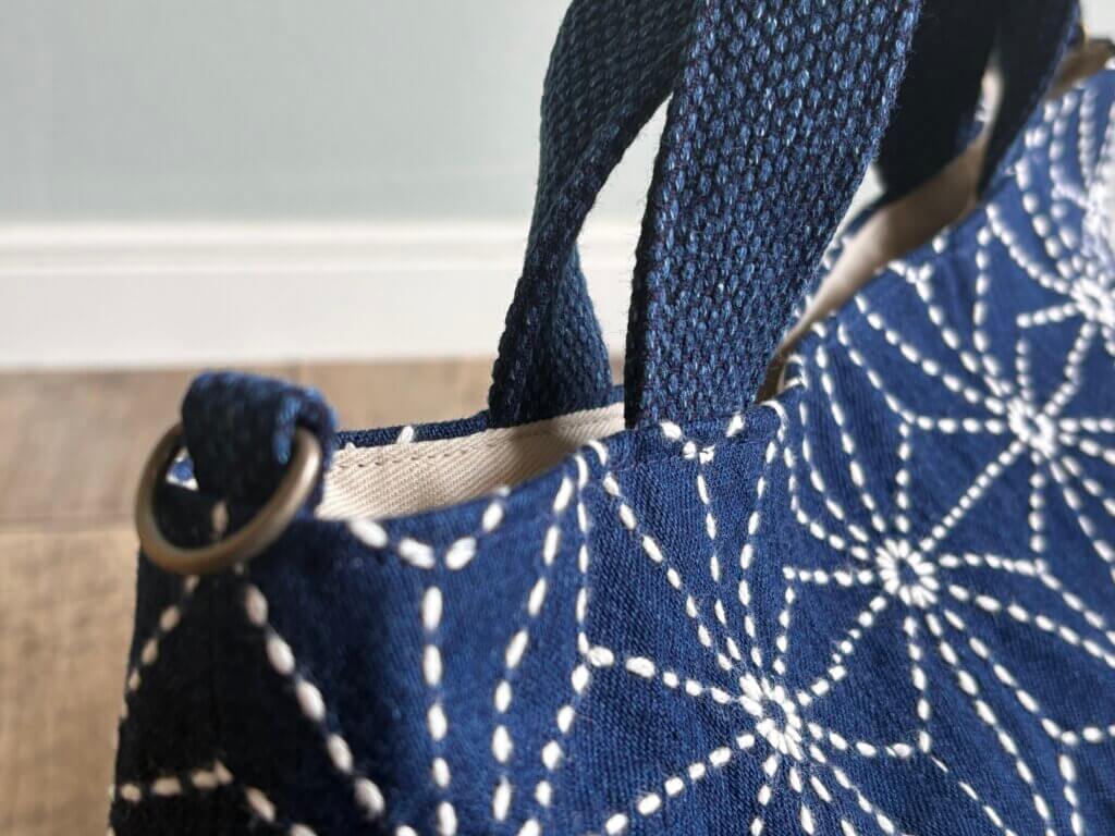 また、持ち手にはあえて元の布ではなく、埼玉県羽生市で作られている「刺子織(さしこおり)」を採用しました。非常に丈夫な藍染布を使うことで、長く安心して愛用いただけるようグレードアップしています。お母様の手仕事に敬意を払いながら、細部までていねいに仕上げました。