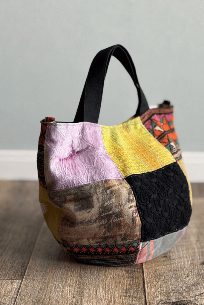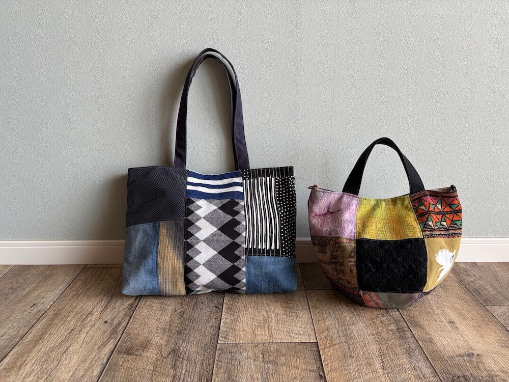 たくさんの衣類を解体し、パズルのように布を合わせていく作業は、私の得意中の得意です。今回は、8種類の生地を使って色鮮やかに仕上げる「ボニーバッグS」と、10種類の生地を使いつつ色味を抑えたシックな「トートバッグ」の2種類をご提案しました。素材の異なる布地を一つにまとめる作業は、たいへんやりがいのある時間でした。